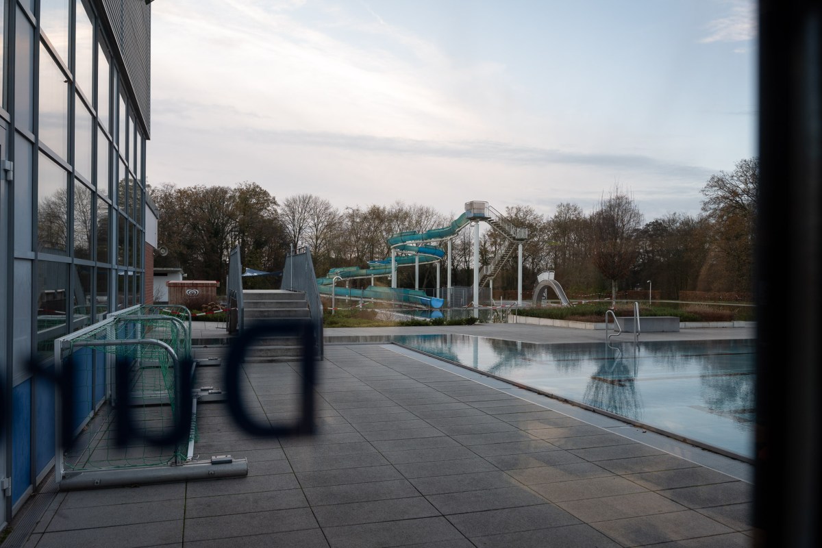 Beim Gang über den Außenbereich fällt unser Blick auf das grüne Wasser des Nichtschwimmerbeckens. Das Wasser aus dem Kinderplanschbecken ist abgelassen, die Spielgeräte sind abgebaut. Sonnenschirme und Liegen überwintern im „Grünen Salon“, wie die Mitarbeiter:innen den Lagerraum nennen.