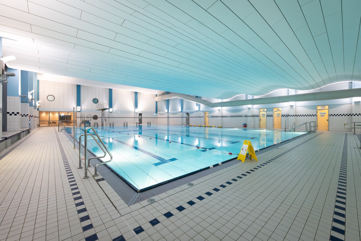 Im Bademeister-Outfit – weißes Poloshirt und dunkelblaue Shorts, dazu bequeme Turnschuhe – betritt sie kurze Zeit später die menschenleere Schwimmhalle. Wir folgen mit blauen Schuhüberziehern, das ist Hygienevorschrift. Die 30 Grad, die hier herrschen, muten in unserer Winterkleidung tropisch an.