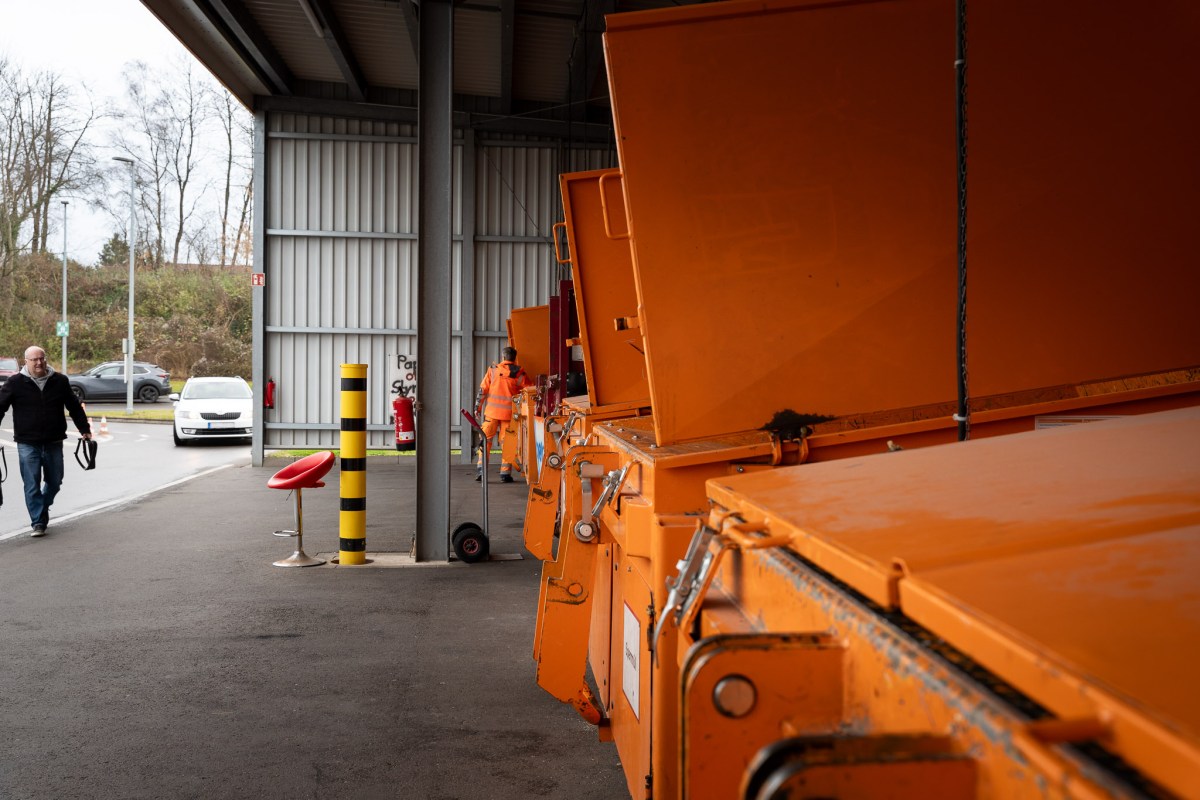 Ein VW Golf kommt neben dem Wartehäuschen zum Stehen. Der Mitarbeiter in orangefarbener Arbeitskleidung will vom Fahrer wissen, was sich im Kofferraum befindet. „Jetzt muss er das Auto aufmachen. Die meisten lachen da nit so wirklich“, sagt Bernd Höller, der Chef des Wertstoffhofs, während der Fahrer den Kofferraum öffnet. „Da ist Restmüll drin, das kann ich jetzt schon sehen. Das kostet Geld.“