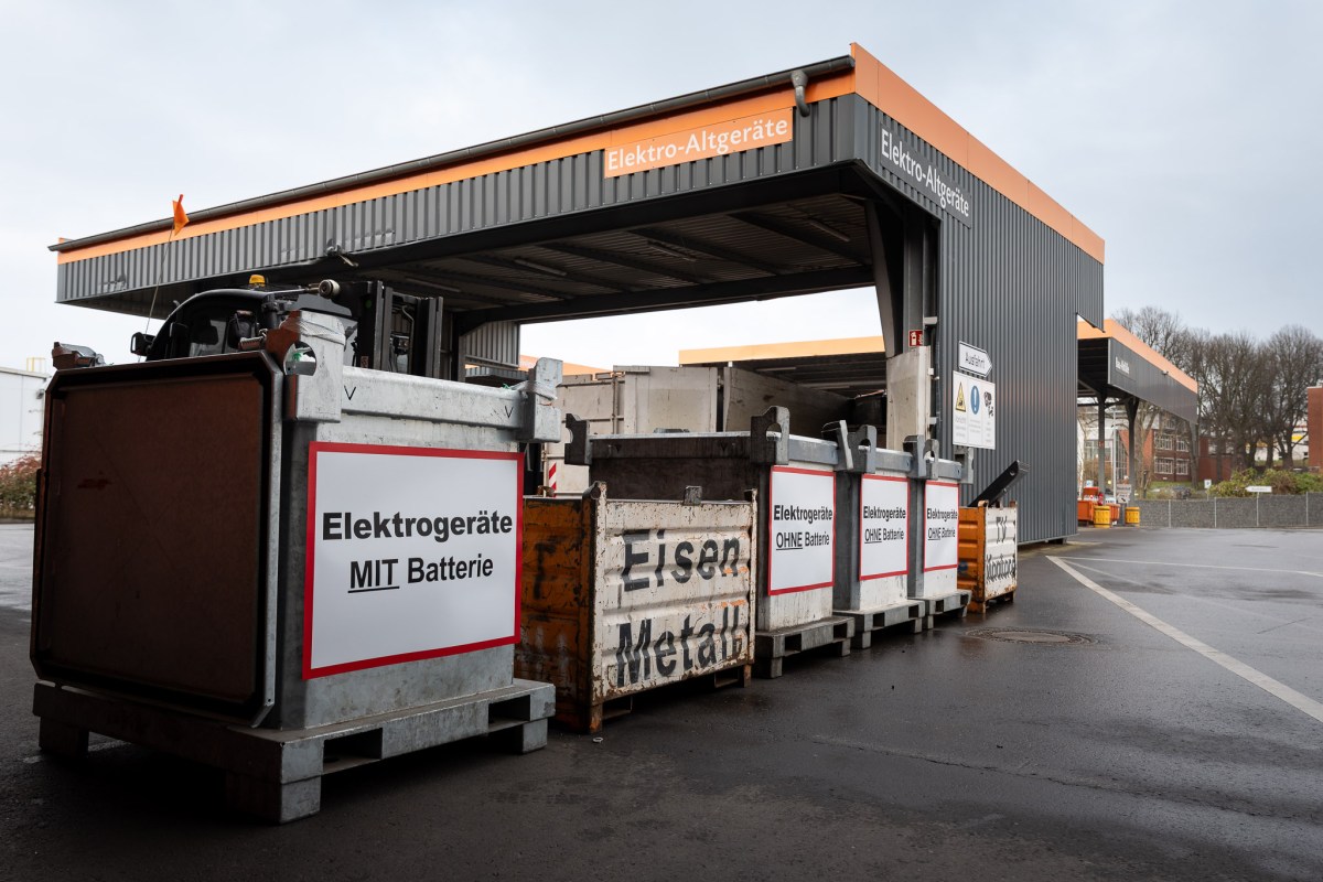 Für Elektrosachen stehen vier kleinere Metallcontainer bereit. „Das ist der gefährlichste Container“, sagt Bernd Höller und zeigt auf das Schild „Elektrogeräte MIT Batterie“. Die Batterien könnten anfangen zu brennen. „Deshalb: Sortieren! Wir gucken, dass die Leute es einigermaßen richtig machen.“