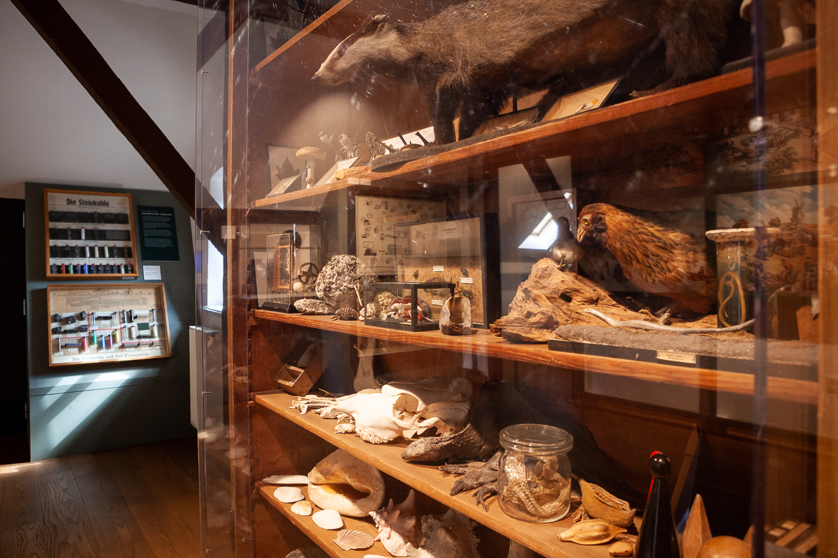 „Die Kinder wollen was machen, die wollen Sachen anfassen“, sagt Olbrisch. Er dreht sich zur großen Vitrine gegenüber der Jahreszeiten-Wand, der „Wunderkammer“, die auf sechs Ebenen Steine, Muscheln, Fossilien, Knochen und sogar Tierexponate zeigt, und fasst mit den Händen auf die Glasscheibe, wie es die kleinen Besucher:innen tun.