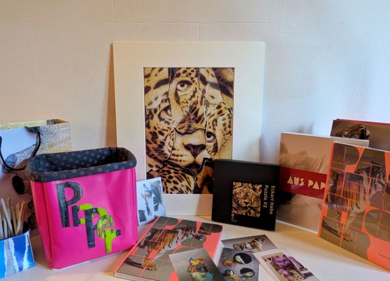 Zum Beispiel das Puzzle #2 von Eckart Hahn. 266 Teile, die nur scheinbar leicht zusammenfinden. Zu sehen ist der Kopf eines Leoparden – zerrissen in viele Papierfetzen. Die Papierfetzen passen formal zusammen, der Leopardenkopf lässt sich jedoch nur noch erahnen. (Preis: 30 Euro)