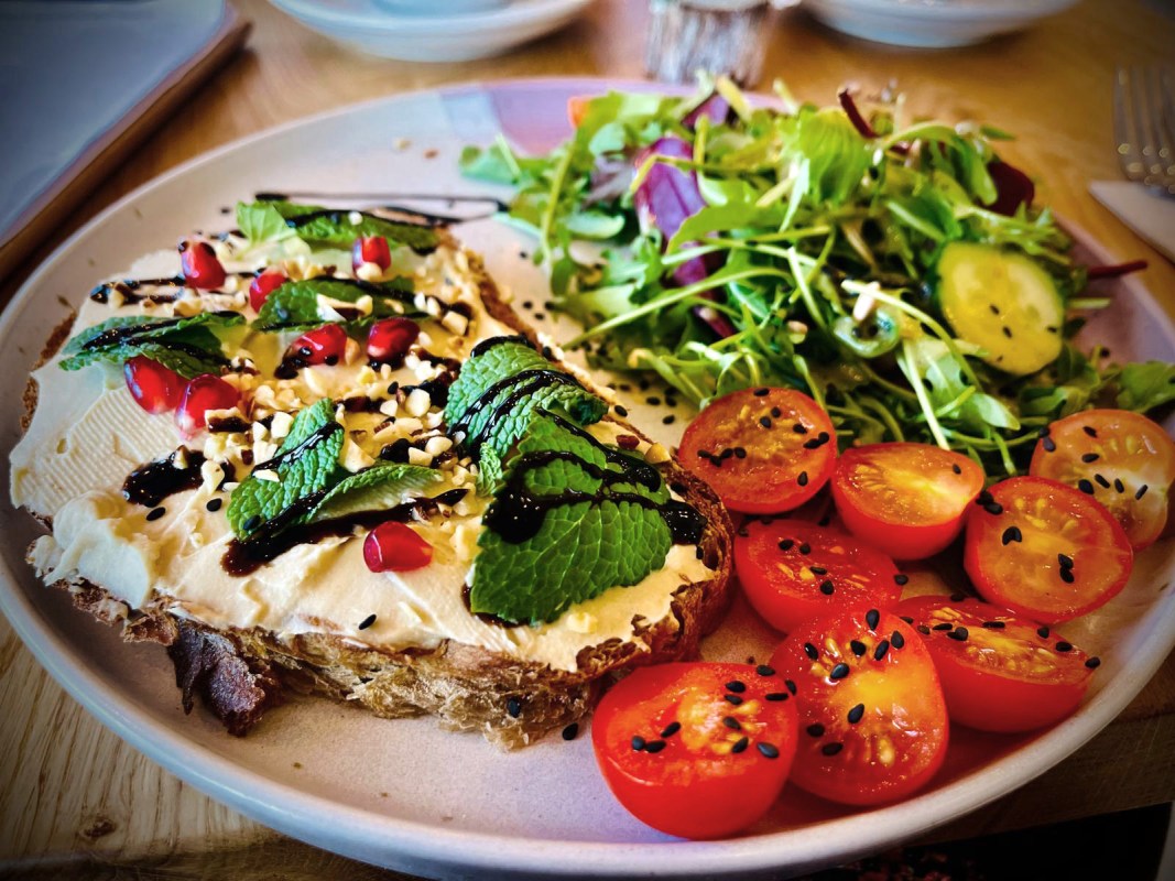 Lisas Stulle (eine geröstete Scheibe Sauerteigbrot) ist üppig mit hausgemachtem Hummus bestrichen, mit Minzblättern, Granatapfelkernen, gehackten Nüssen und Balsamico garniert und wird mit Cocktailtomaten und frischer Salatbeilage serviert (11,90 Euro). Optisch und geschmacklich ein Genuss.