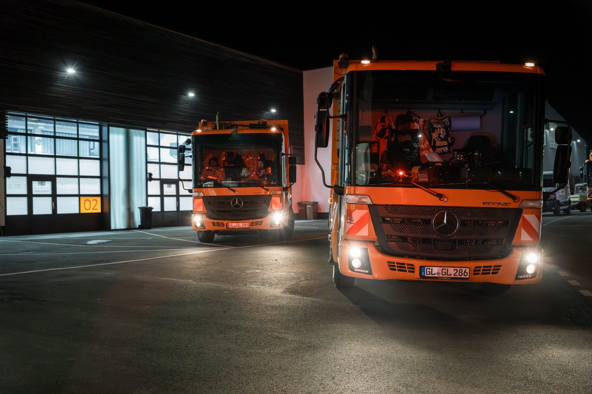 Draußen ist es noch dunkel, auf dem Betriebshof ist Orange die dominierende Farbe. Müllwagen mit orange blinkendem Warnlicht auf dem Dach rangieren, Männer in neon-orangefarbener Kleidung mit Leuchtstreifen besprechen sich im Personalraum, steigen in ihre Fahrzeuge.