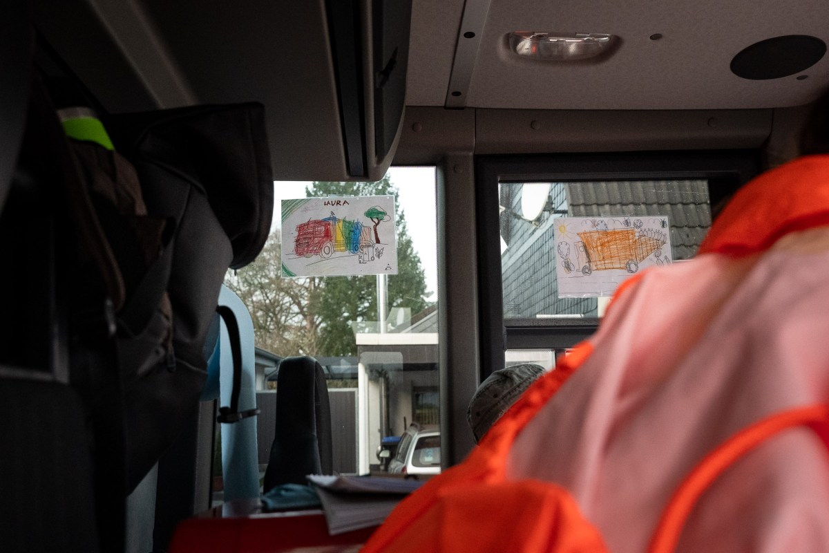 Stolz zeigt Achim einige Kunstwerke und einlaminierte Bilder in der Fahrerkabine. Ein Kind hat einen Müllwagen gemalt, natürlich in Orange. Dahinter steht ein Mann mit einem Sack in der Hand. Er lacht. So wie Tobi. „Das macht echt Spaß mit dem zu arbeiten. Tobi hat selten schlechte Laune“, sagt der 55-Jährige.