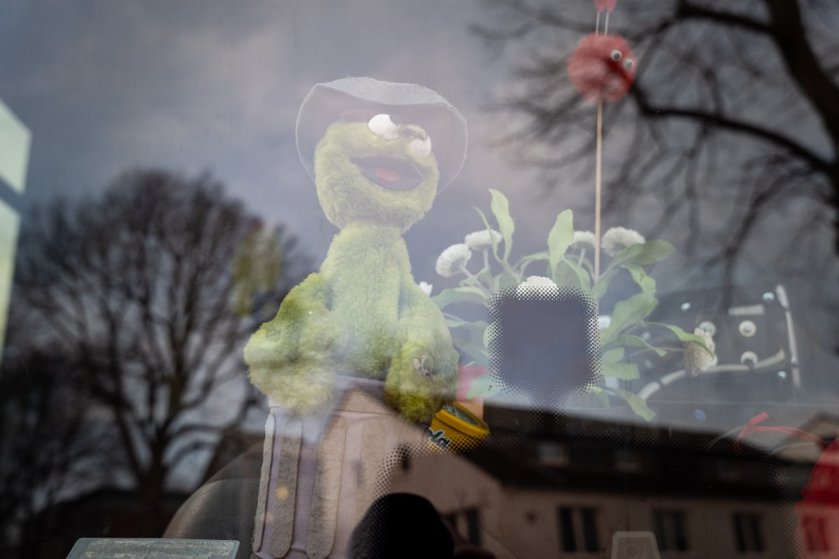 Oben auf der Frontscheibe leuchten zwei LED-Augen, auf dem Armaturenbrett steht allerlei Deko – eine künstliche Topfpflanze, ein lachender roter Dom aus Plüsch und ein grüner Oskar, der aus einer Tonne guckt. „Den haben wir aus dem Müll gerettet“, sagt Achim.