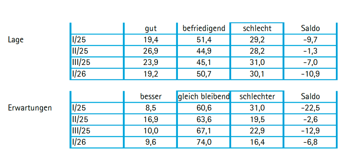 Die Geschäftslage verharrt bereits zum fünften Mal in Folge im negativen Bereich. Drei von zehn Unternehmen bewerten ihre Lage als schlecht, weniger als ein Viertel spricht von einer guten Situation. Auch der Blick nach vorne bleibt düster: Lediglich zwölf Prozent der Betriebe rechnen mit einer Verbesserung, während mehr als jedes vierte Unternehmen eine Verschlechterung der wirtschaftlichen Lage befürchtet.
