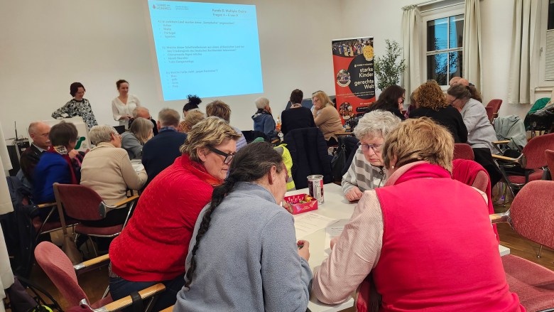 Der 9. Gläbbicher Quiz Abend – knifflige Fragen, die von 54 Personen in 12 Teams gelöst werden mussten. Brigitta Opiela begrüßte die Anwesenden und gesellte sich danach zum Team „Gläbbicher EineWeltler“.
