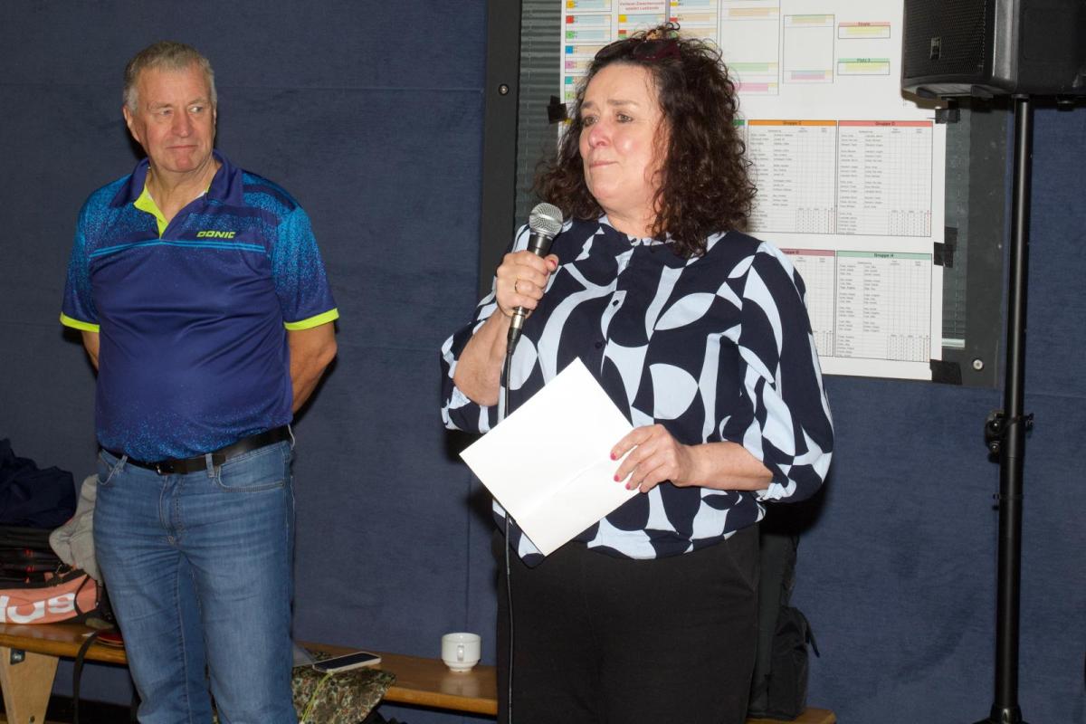 Die Stellvertretende Bürgermeisterin Brigitta Opiela (die den durch Urlaub verhinderten Bürgermeister vertrat) sprach ein sehr herzliches Grußwort und eröffnete das Turnier durch ein Spiel an der Platte mit dem Autor dieses Artikels, das sie nur knapp verlor.
