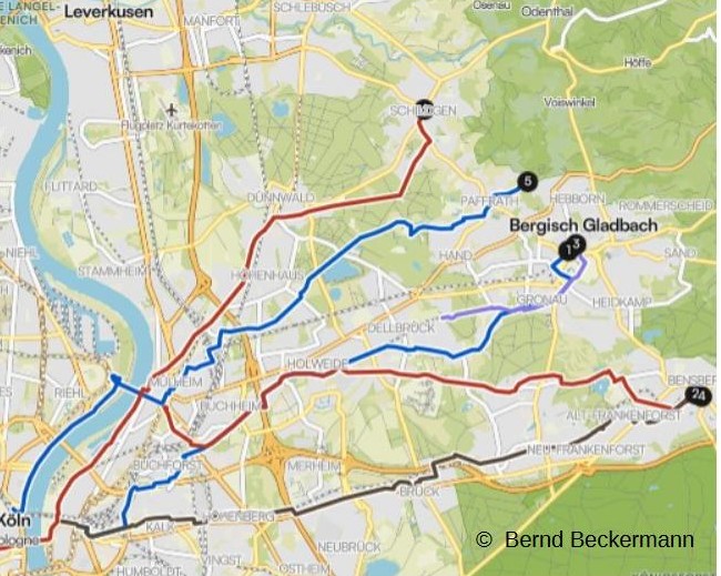 Von Bensberg durch Frankenforst über die Fahrradstrasse Nachtigallenstrasse, Hasenweg, in Refrath auf die andere Seite der Bahn, Siegenstrasse, an der Bahnhaltestelle Lustheide in den Buchenkampsweg, Im Buchenkamp, Brücker Gemarkenweg, über Autobahn und KVB hinweg, Overather Str, Am Klausenberg, über den Brücker Mauspfad, 20m nach Süden, rechts in einen Zwischenweg zur Petersenstrasse, links, dann rechts in Diesterwegstrasse zur Haltestelle Flehbachstrasse, Unterer Bruchweg führt parallel zum Flehbach, KEIN AUTO! Am Ende unter Autobahnzubringer und über Bahngleise nach rechts Broichstrasse, links von Eltz Str, an St. Gereon vorbei, Ostmerheimer Str. Kratzweg bis Kalker Friedhof, über die Autobahn, parallel zur KVB durch die Merheimer Heide KEIN AUTO! Merheimer Heideweg, die B8 queren, links parallel der KVB, die Höhenberger Str. queren in den Höhenberger Kirchweg, dann an der B55 unter den Gleisen lang. In Kalk entweder die Kalker Hauptstrasse mit gutem Radweg aber viel Fussgängern und parkenden Autos, oder parallel Thumpstr. Kapitelstr. Vorsterstrasse, an der Nordseite der Kalk-Arcaden vorbei, Gummersbacher Str bis zur Lanxess-Arena, dort hoch auf den Vorplatz, auf der Nordseite vom Stadthaus über eine Brücke über die Deutz Mülheimer ohne Ampel bis zum Bahnhof Deutz, von da über die Hohenzollern – oder die Deutzer Brücke nach Köln City. Gute Fahrt. Von Bensberg mit E-Bike ca. 45min. bis zum Dom