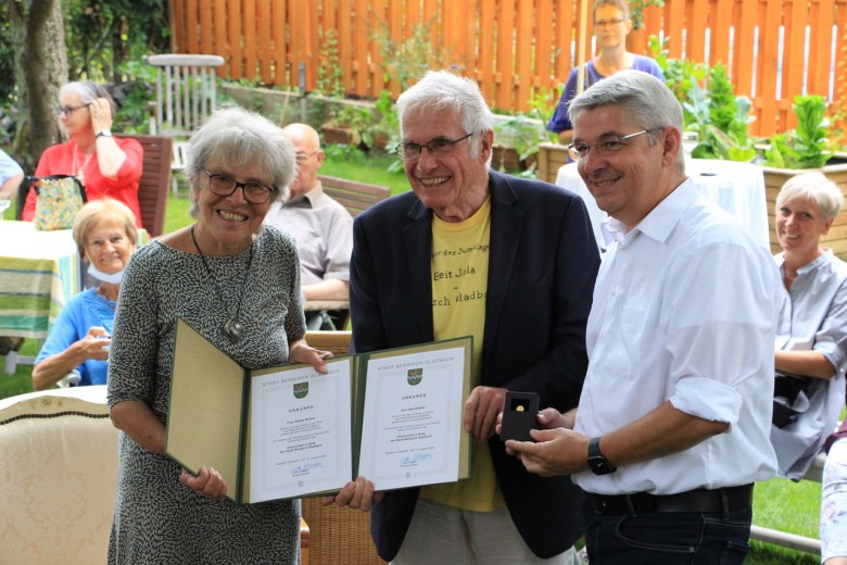 Sabine Becker und Axel Becker gemeinsam mit dem damaligen Bürgermeister Lutz Urbach bei der Verleihung der Goldenen Ehrennadel der Stadt Bergisch Gladbach. Foto: Stadt GL