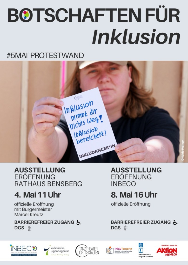 Im Rahmen des Europäischen Protesttags zur Gleichstellung von Menschen mit Behinderung wird am Montag, den 4. Mai, um 11 Uhr die Ausstellung „Botschaften für Inklusion“ im Rathaus Bensberg eröffnet. Die Ausstellung ist auf den Fluren im Erdgeschoss (Richtung Ratssaal) sowie im 1. Obergeschoss (linker Flügel) zu sehen.