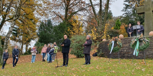 Die Stadt Bergisch Gladbach hat gemeinsam mit dem Ortsverband des Volksbundes Deutsche Kriegsgräberfürsorge, mit Politik und Gesellschaft die Gedenkfeier zum Volkstrauertag begangen. Am Sonntagversammelten sich die Teilnehmenden am Ehrenmal des städtischen Friedhofs in Bensberg.