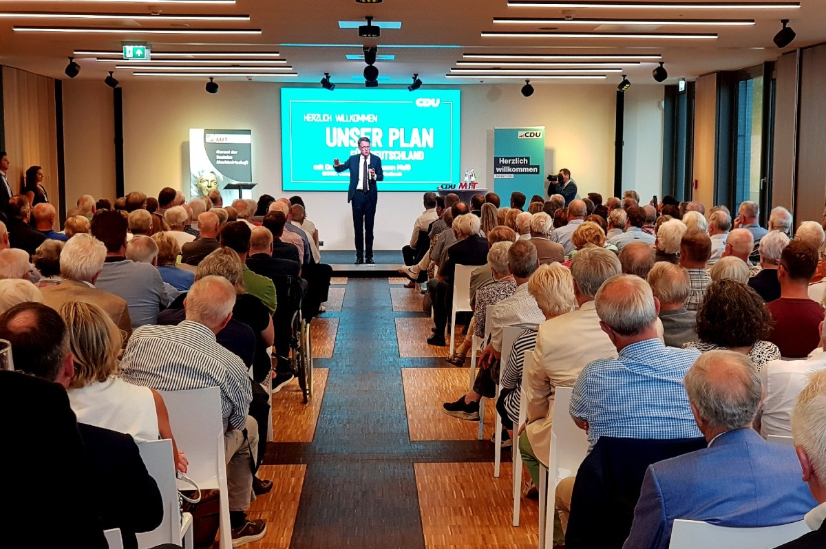 Im offiziell noch gar nicht eröffneten Isotec-Campus hat Carsten Linnemann, Generalsekretär der CDU, vor 260 Zuhörern den „Plan für Deutschland“ seiner Partei vorgestellt. Die CDU sei gut vorbereitet, in einem Jahr oder auch schon in wenigen Monaten die Regierung zu übernehmen. Eine Koalition „mit diesen Grünen“ schloss er aus, als Mehrheitsbeschaffer für einen echten Kurswechsel bleibe eigentlich nur die SPD. in-gl.de**