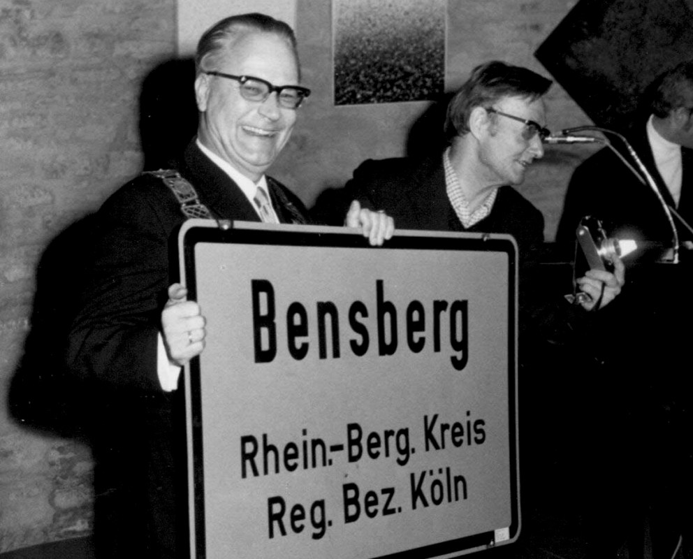 In der letzten Sitzung des Rates der Stadt Bensberg erhielt Bürgermeister Ulrich Müller-Frank ein Ortsschild – das ab dem 1.1.1975 keine Gültigkeit mehr hatte. Foto: Stadtarchiv GL