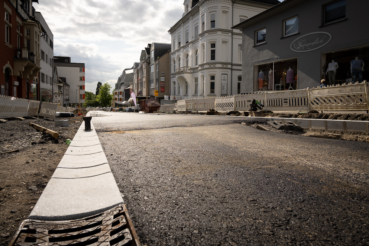 Sechs Monate nach dem Start der Bauarbeiten im unteren Teil der Schlossstraße sieht die Stadtverwaltung jetzt das erste Etappenziel in Sicht: Die endgültige Asphaltdecke soll in der nächsten Woche verlegt werden, die Freigabe dann relativ rasch folgen. Im nächsten Schritt wird die Nikolausstraße voll gesperrt.