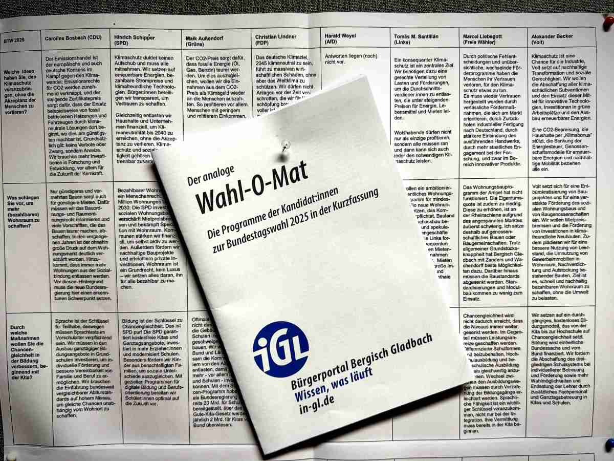 Nicht die Parteien und die Politik geben die Themen in diesem Wahlkampf vor, sondern die Bürgerinnen und Wähler selbst: Nach diesem Prinzip haben wir Themen und Fragen gesammelt, die Ihnen bei der Kommunalwahl besonders wichtig sind, und den Parteien vorgelegt. Das Ergebnis ist ein lokaler und analoger Wahl-O-Mat, mit dem Sie die Kernpositionen bei der Kommunalwahl rasch vergleichen können.