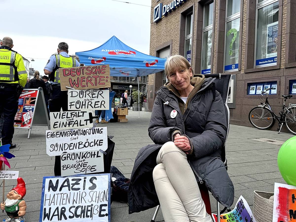 Mehr als 300 Menschen sind dem Aufruf des Vereins für Demokratie und Vielfalt gefolgt und haben bei einem musikalischen Flashmob das Bläck Fööss-Lied „Unser Stammbaum“ gesungen, um für die Wahl am Sonntag zu werben. Fast für noch mehr Aufmerksamkeit sorgte allerdings eine Frau, die sich mit ihren Protestplakaten alleine vor den AfD-Stand setze und trotz körperlicher Einschüchterungen nicht wich.