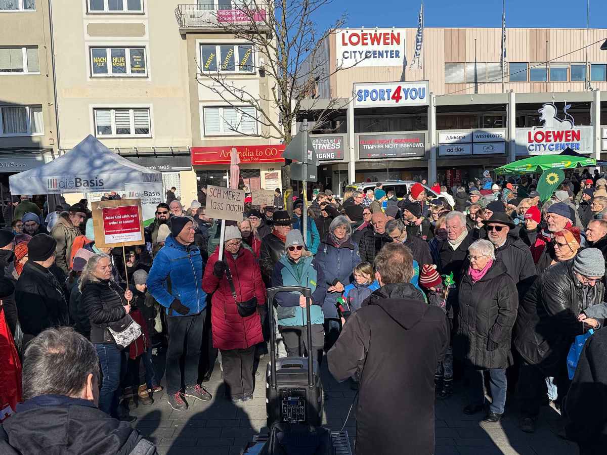 Redner:innen von Linke, SPD und Grüne haben am Samstag bei einer Kundgebung in der Bergisch Gladbacher Innenstadt gegen jede Form der Zusammenarbeit mit der AfD demonstriert und dabei die CDU scharf kritisiert. Gut 200 Personen hatten sich am Trotzenburgplatz versammelt.