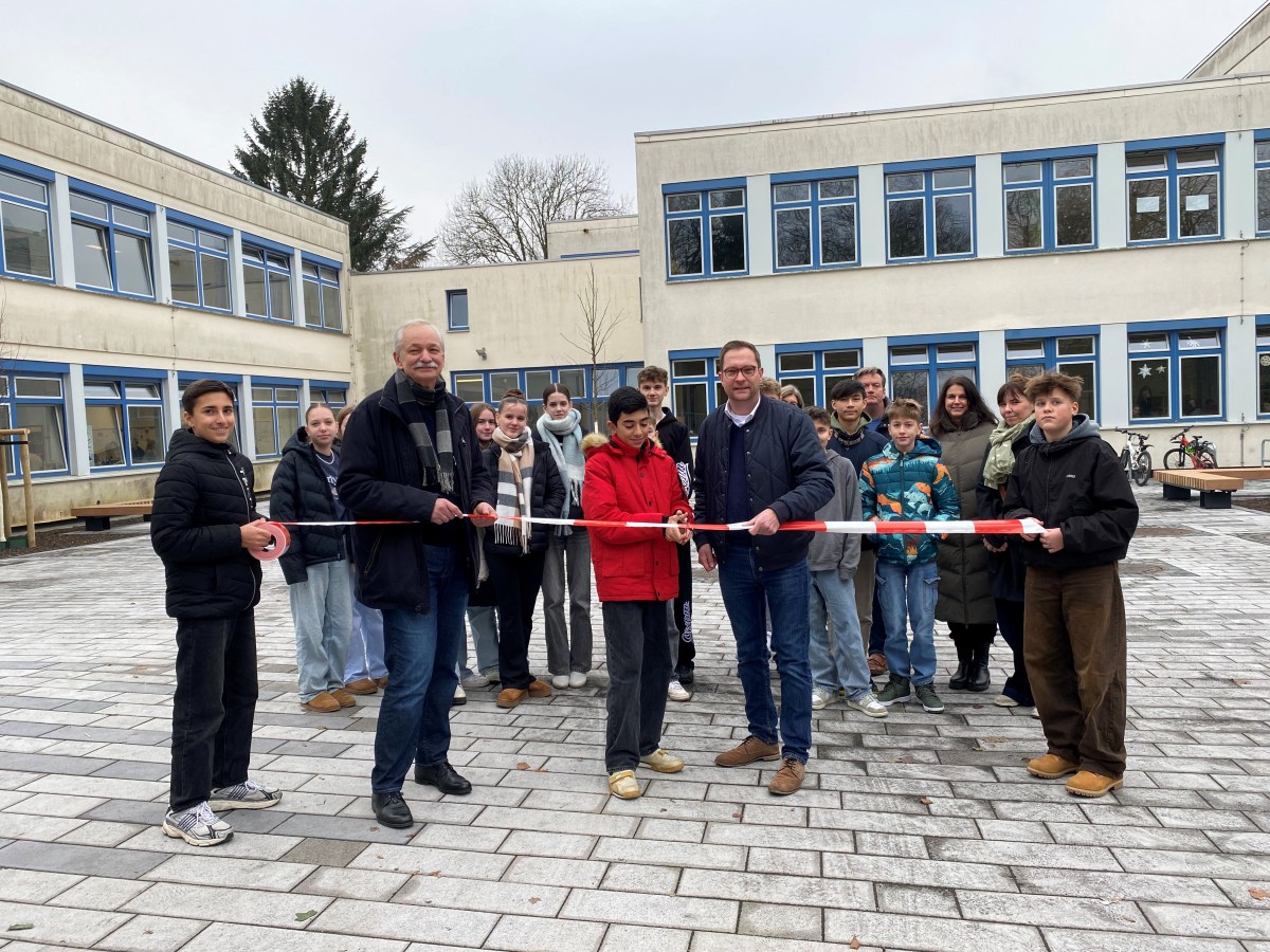 Der Mittelstufenschulhof von Gymnasium und Realschule in Herkenrath wurde neu gestaltet. Sitzgelegenheiten und neu gepflanzte Bäume verwandeln den Außenbereich in einen einladenden Aufenthaltsort, außerdem wurden zusätzliche Abstellplätze für Fahrräder geschaffen. Der Beigeordnete Thore Eggert übergab den neuen Pausenhof nun symbolisch an die Schule.