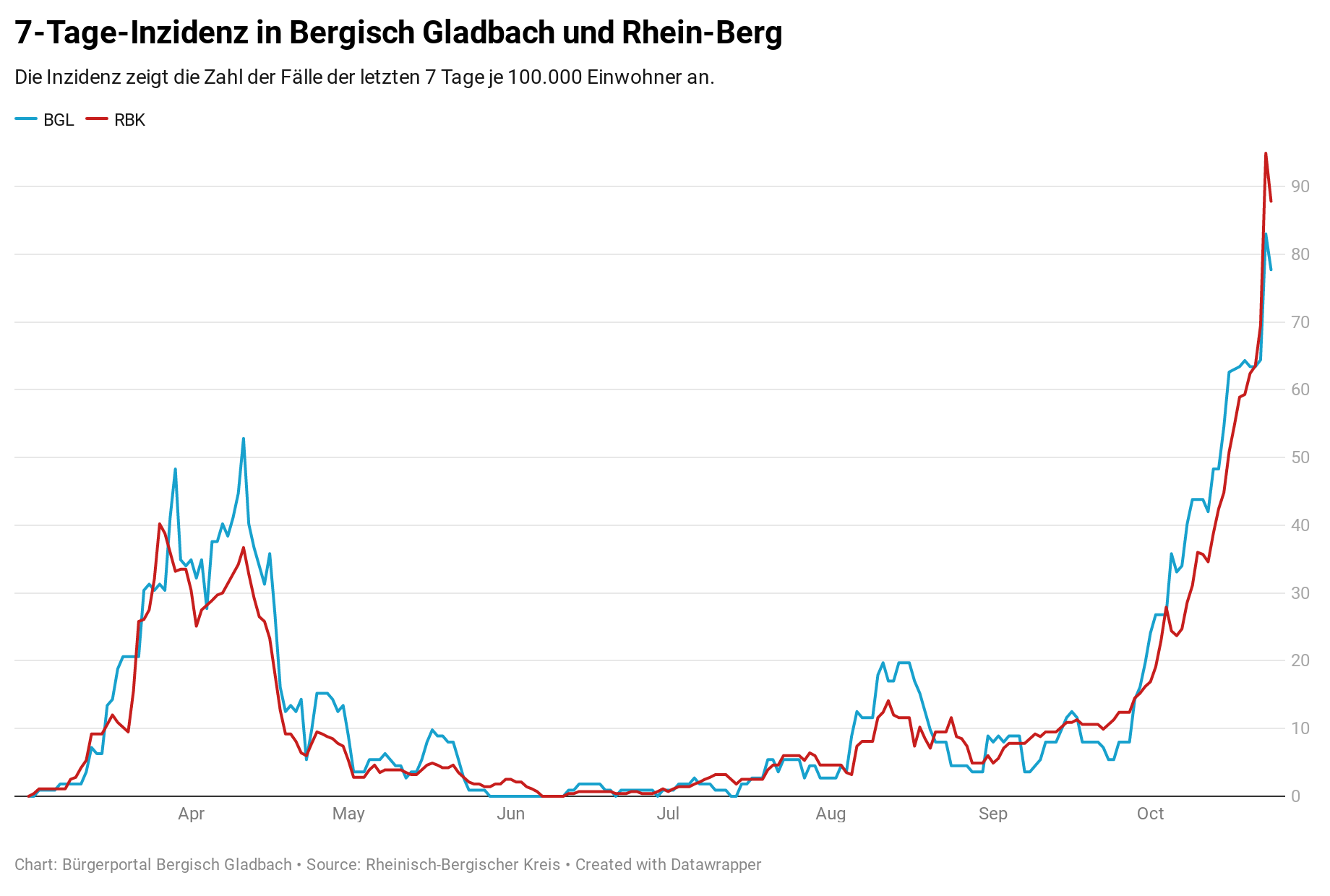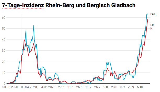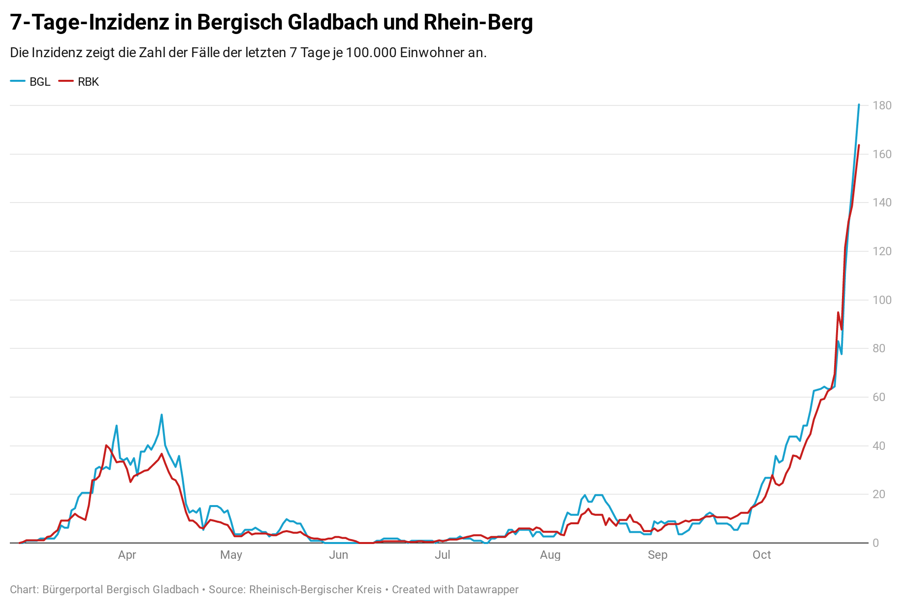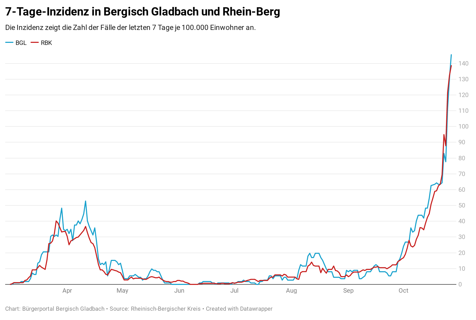 Am Donnerstag hat das Gesundheitsamt im gesamten Rheinisch-Bergischen Kreis mehr positive Tests als je zuvor an einem einzelnen Tag registriert. Die 7-Tage-Inzidenz stieg kräftig auf knapp 70. Zwar wurden 20 der Fälle in Bergisch Gladbach gemeldet, die Corona-Pandemie zieht aber im Moment in den kleineren Kommunen deutlich schneller an.