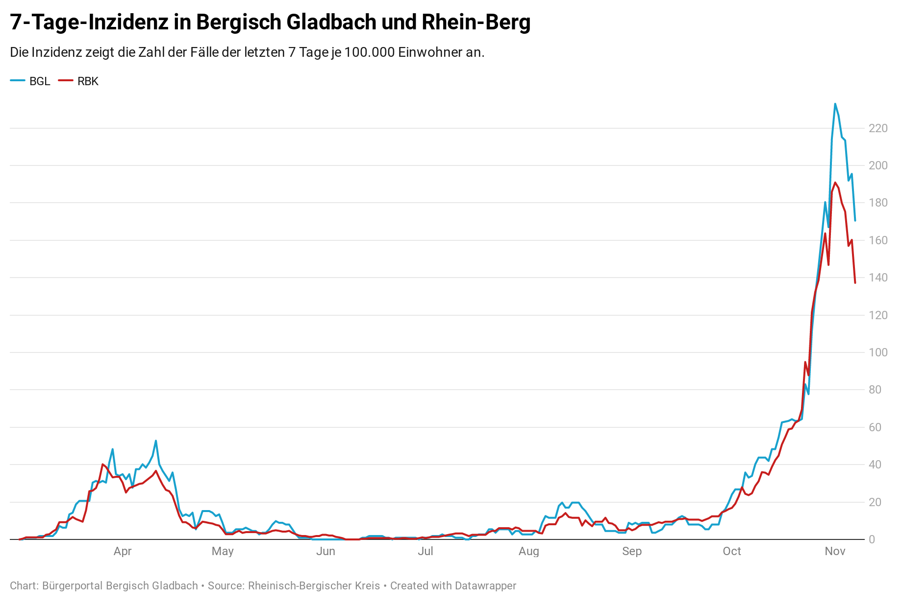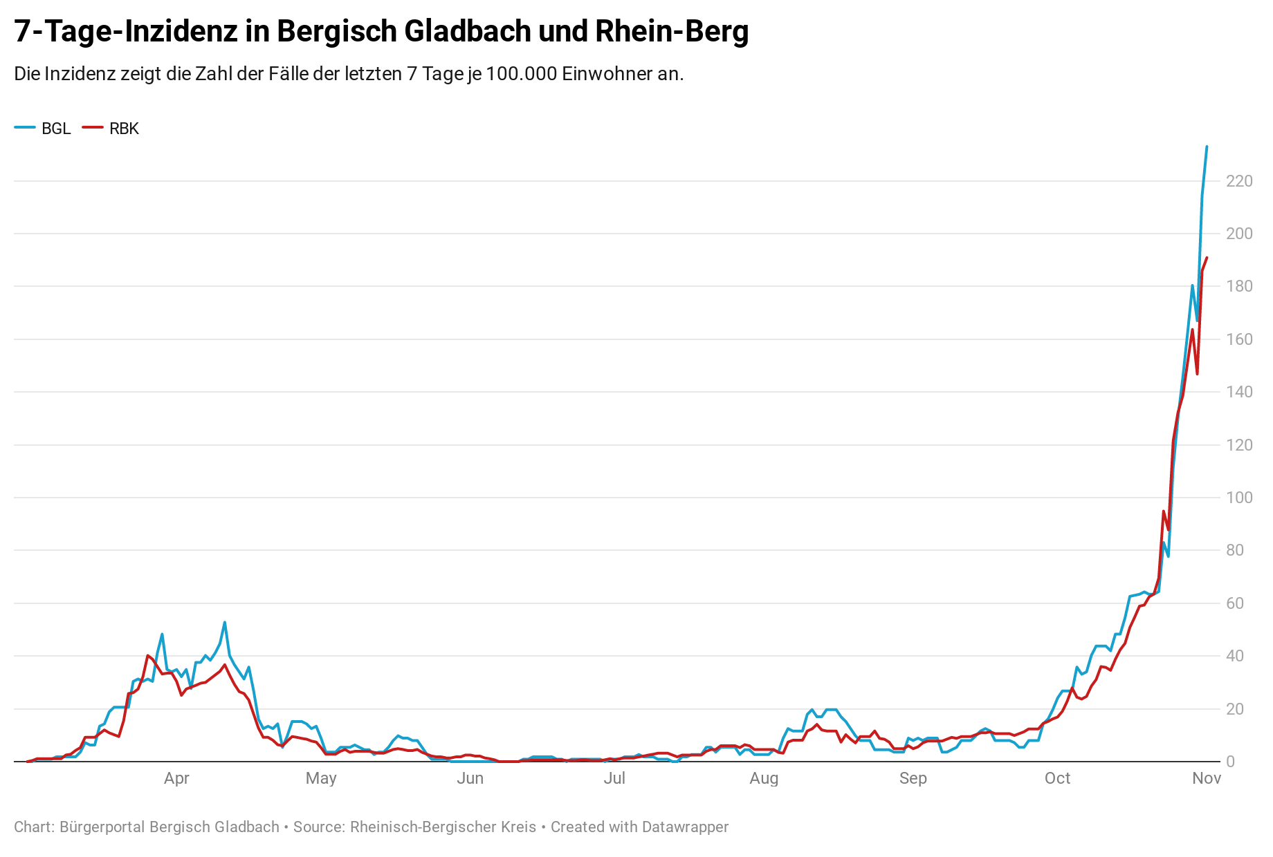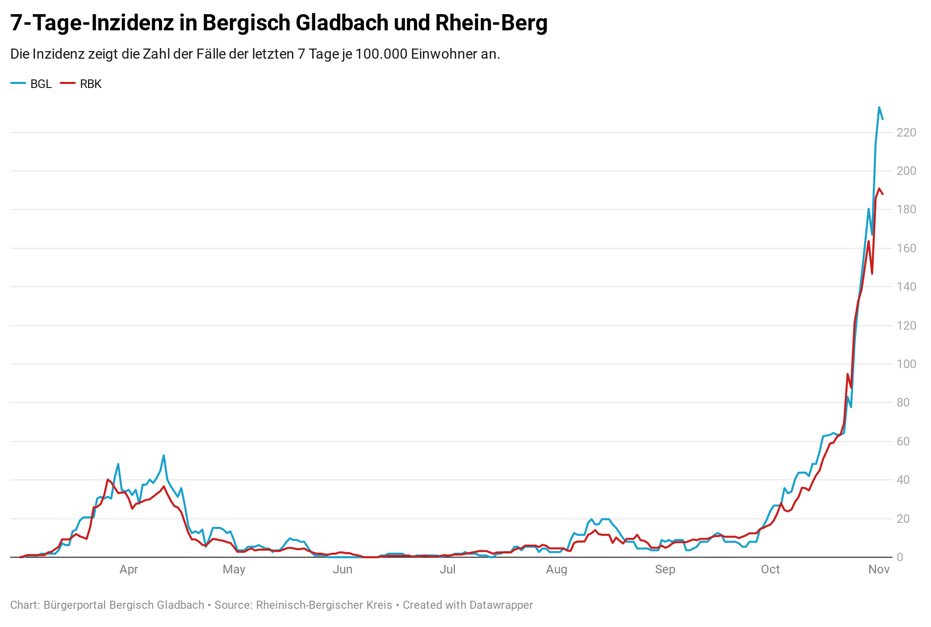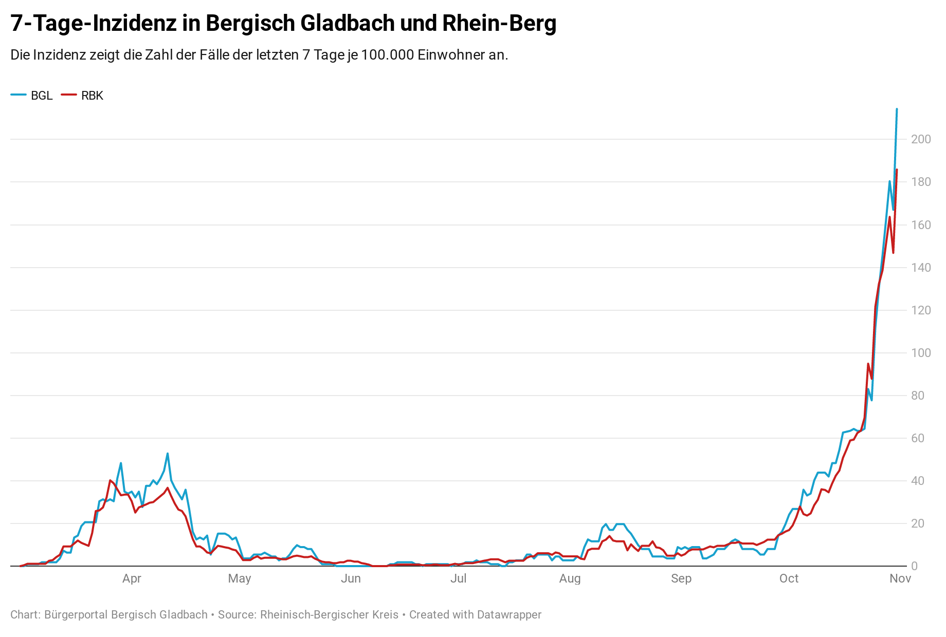 Am Donnerstag hat das Gesundheitsamt im gesamten Rheinisch-Bergischen Kreis mehr positive Tests als je zuvor an einem einzelnen Tag registriert. Die 7-Tage-Inzidenz stieg kräftig auf knapp 70. Zwar wurden 20 der Fälle in Bergisch Gladbach gemeldet, die Corona-Pandemie zieht aber im Moment in den kleineren Kommunen deutlich schneller an.
