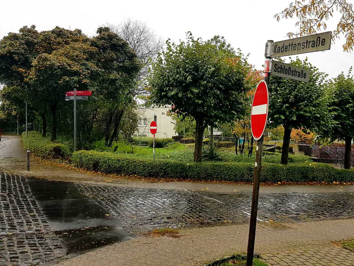 Die Stadt Bergisch Gladbach richtet in einem bereits fertiggestellten Teil der Schlossstraße eine Fußgängerzone ein. Nur so sei der Autoverkehr unter Kontrolle zu bringen, der verbotenerweise in die Sackgasse ohne Wendemöglichkeit hineindrängt. Mit dem Fortgang der Bauarbeiten wird die Sackgasse immer länger – und dann wieder verschwinden.