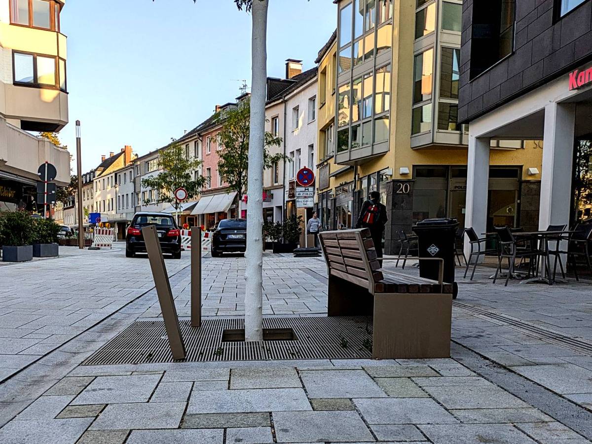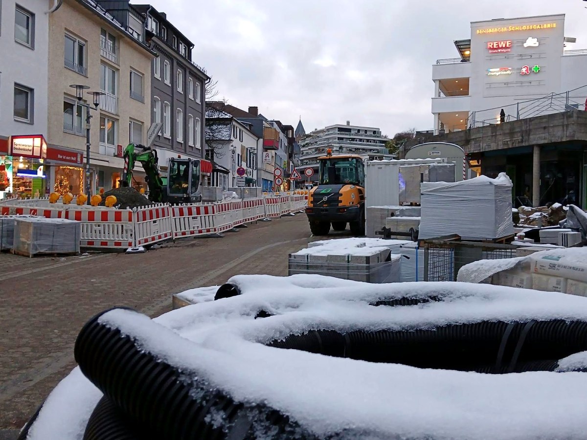 Mit dem Fortschritt der Bauarbeiten auf der Bensberger Einkaufsstraße werden auch die neuen Bäume gesetzt – an diesem Dienstag werden zehn Gleditschien erwartet. Vor der Schlossgalerie gehen die Vorbereitungen für den Einbau des Fontänenfelds weiter.
