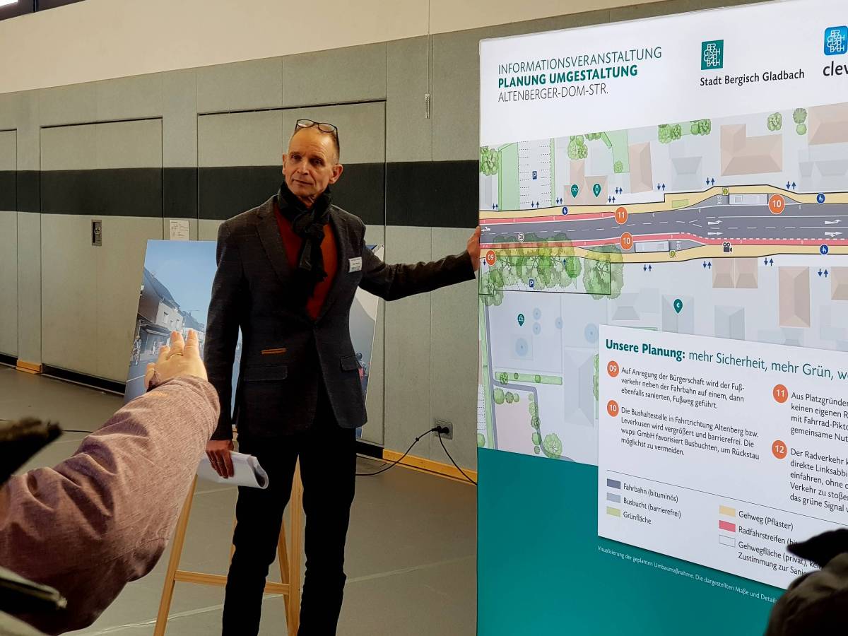 Bei der Informationsveranstaltung der Stadt zum Umbau der Altenberger-Dom-Straße gab es viele Detailfragen und einige Zustimmung, aber auch viele Vorbehalte – die sich auf die komplexe und kleinteilige Verkehrsführung sowie mögliche Ausweichverkehre konzentrierten.